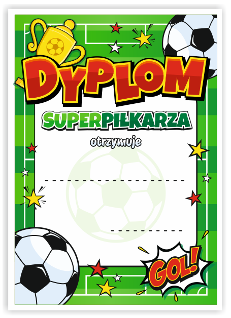 Kolorowy dyplom dla dzieci. Doskonale sprawdzi się w szkółkach piłkarskich – jako wyróżnienie za aktywny udział w zajęciach sportowych, udział w turniejach oraz na zakończenie sezonu treningowego.