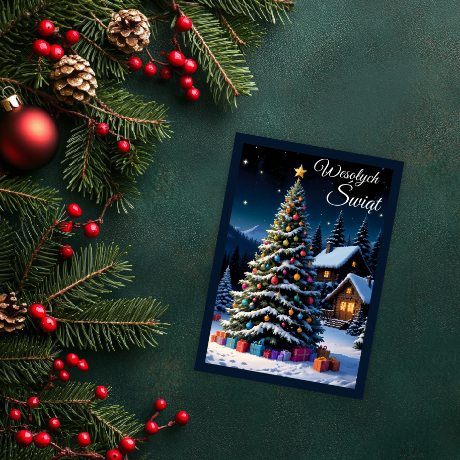 Kolorowa kartka z motywem świątecznym będzie idealnym upominkiem do wręczenia z okazji Świąt Bożego Narodzenia.