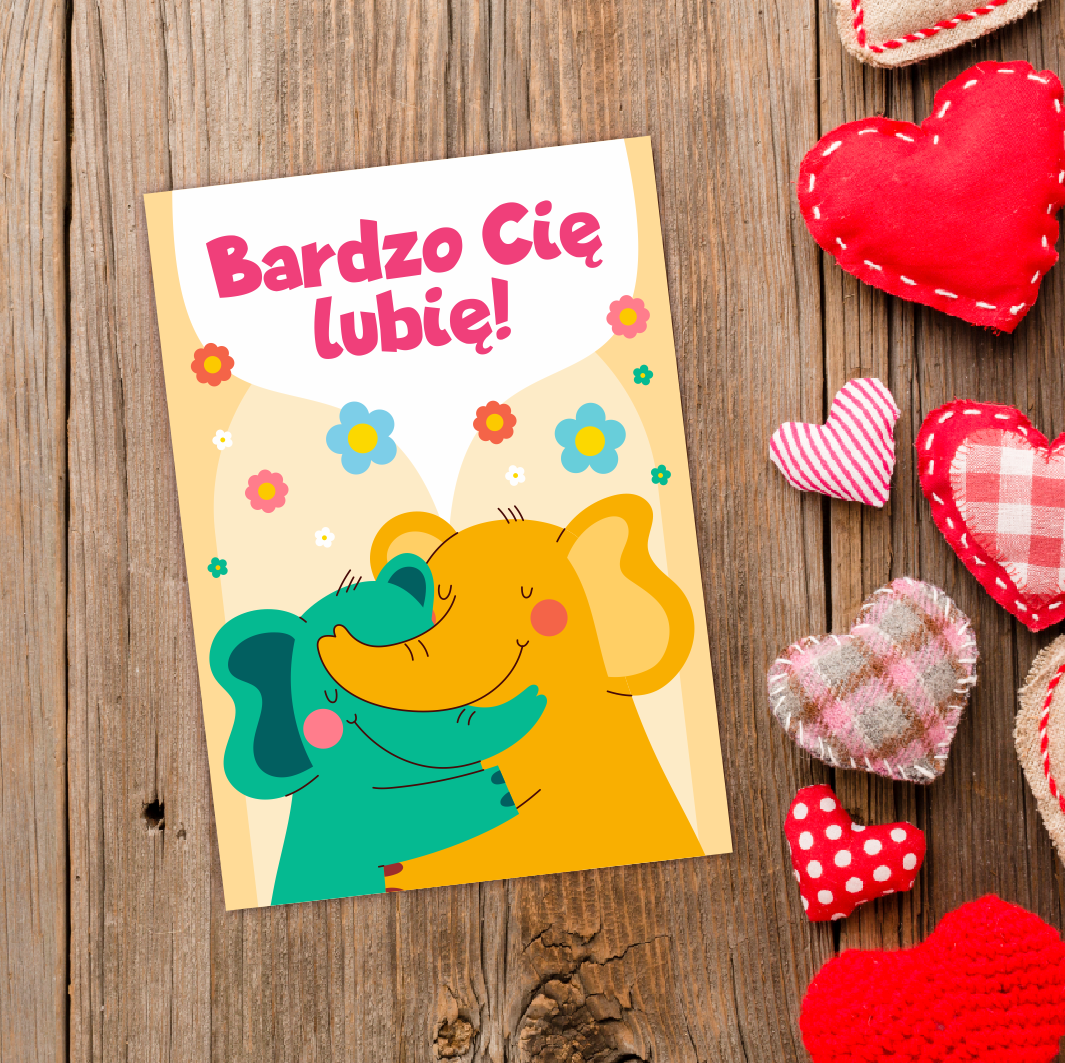 Kolorowa kartka z motywem walentynkowym będzie idealnym upominkiem do wręczenia np. z okazji Walentynek.