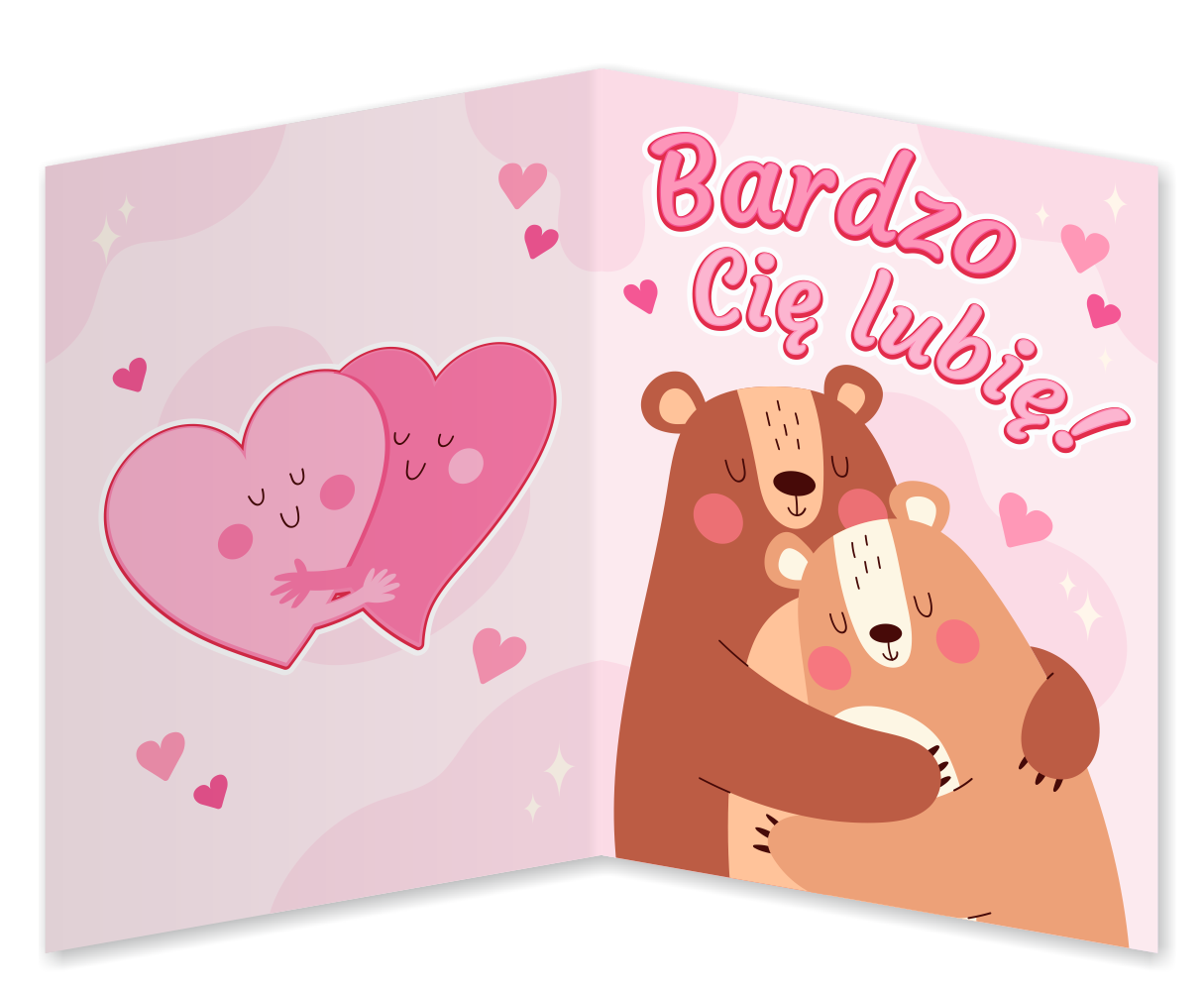 Kolorowa kartka z motywem walentynkowym, zadrukowana dwustronnie, w formie składanej książeczki będzie idealnym upominkiem do wręczenia np. z okazji Walentynek.
