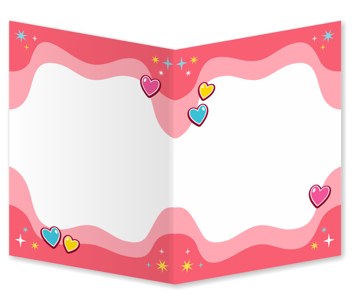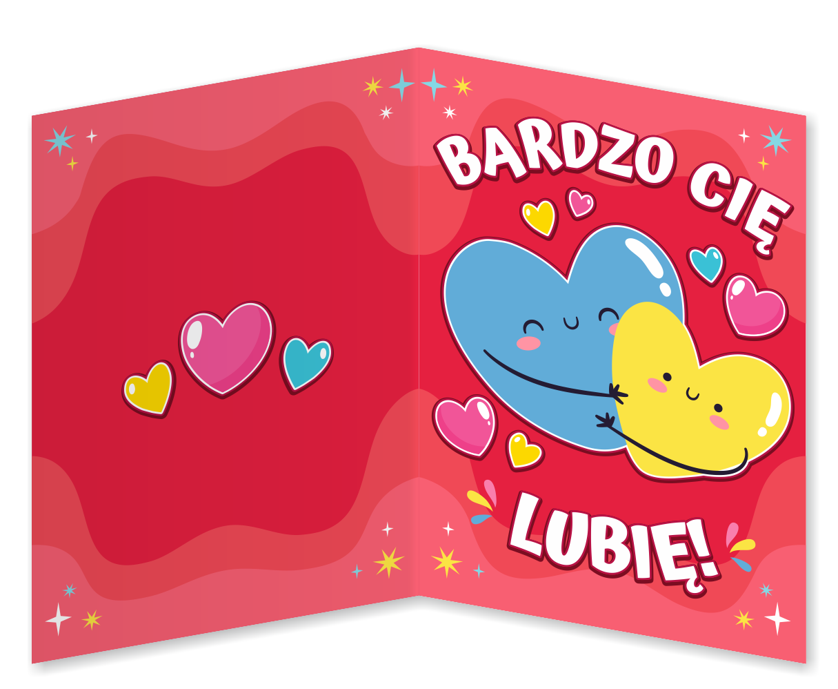 Kolorowa kartka z motywem walentynkowym, zadrukowana dwustronnie, w formie składanej książeczki będzie idealnym upominkiem do wręczenia np. z okazji Walentynek.