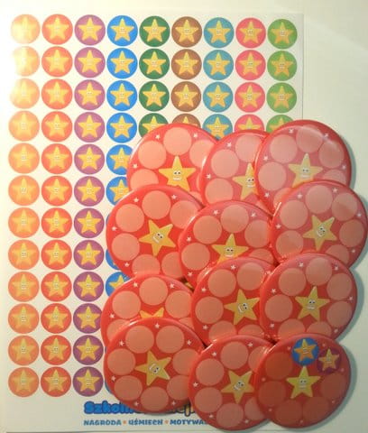 W skład pakietu wchodzi również arkusz 108 małych naklejek gwiazdek - wystarczająco, aby każde dziecko mogło zapełnić naklejkami całą przypinkę.