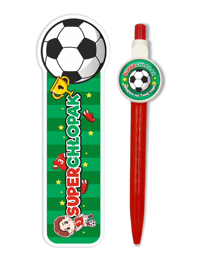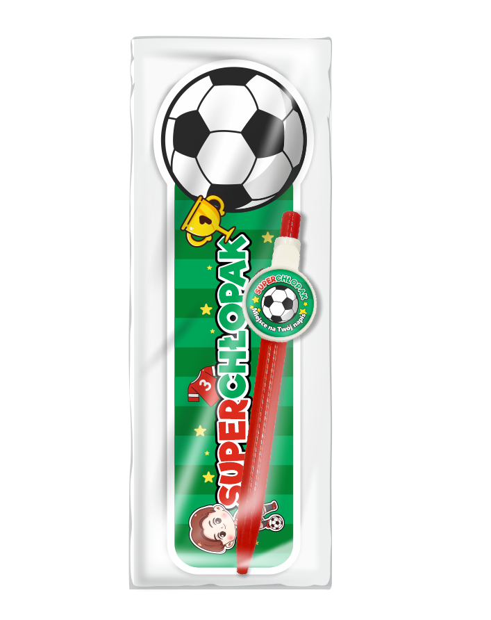 - długopis z kolorowym tematycznym znaczkiem i napisem u góry "SUPERCHŁOPAK",