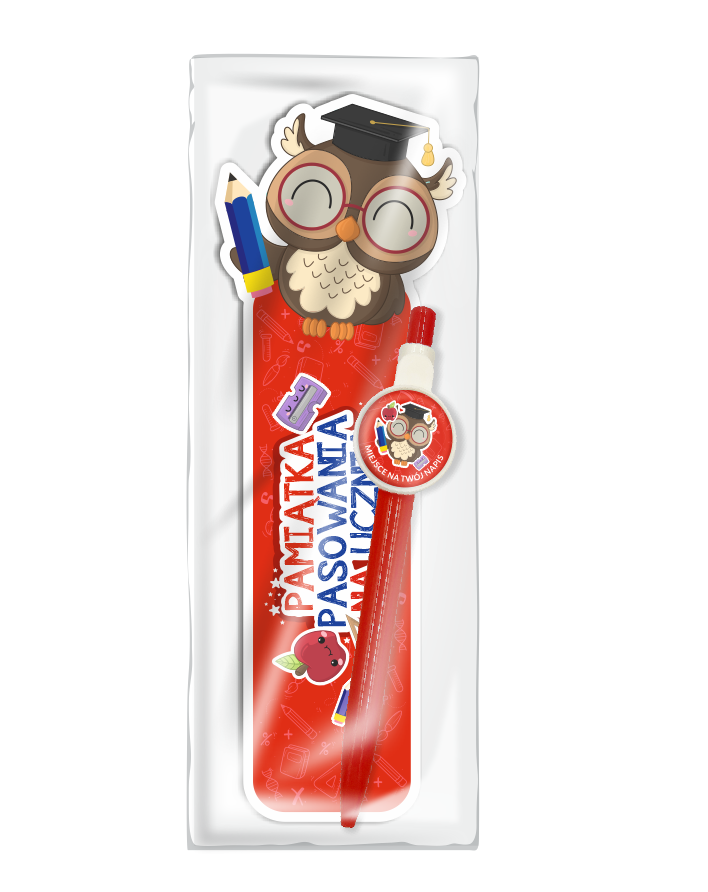 Zestaw prezentowy "PAMIĄTKA PASOWANIA NA UCZNIA" - Sowa (długopis + zakładka do książki)